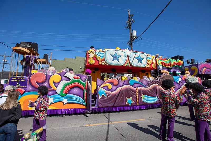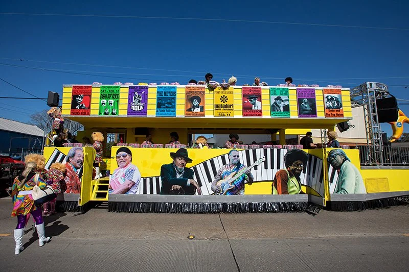 The float’s name derives from the daughter of one Captain suggesting it in making reference to her godfather, another Captain: “What will the next float be named, the Funky Uncle?” More than fun among long-time friends and a mobile music hall to help Carnival goers celebrate, the float has a more weighty mission in bringing Funk and music to underserved communities. We use the float as a mobile stage during the off-months to bring Funk to the people because, after all, the Law of Supergroovalisticprositfunkstication declares that one must “Give the people what-they want when they want and they wants it all the time.” During the period 2018 to the beginning of COVID lockdowns in 2020, and with the mighty and volunteer help of Baline Kern Artists, we brought live free Funk on Funky Uncle to eight underserved communities (or about once a quarter). Since the onset of the pandemic and lockdown inApril 2020 we have live streamed a free concert each week—or about seventy three concerts—to the universe, providing entertainment for the people (especially during the darkest days of the Pandemic lockdown), work for musicians, entertainment professionals, and gig workers when there was little, and raised money for those in the music and entertainment community effected medically or economically by the pandemic. We have raised over $450,000 and made distributions to more than 600 musicians, entertainment professionals, and gig workers. Click below to see video of the Funky Uncle Float in action!