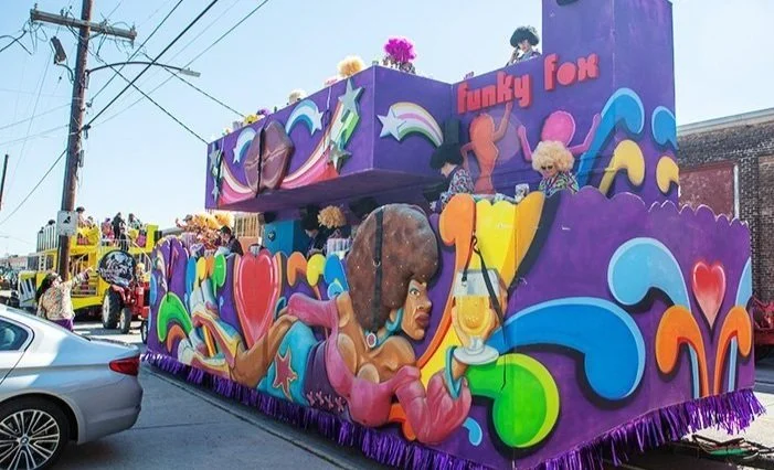 On Valentine’s Day 2015, the Love Child was born to the Funky Tucks and the Funky Fox. The Love Child, like most children, prefers to be situate between both parents anmd squeezes in between the Funky Tucks and the Funky Fox, creating a three-unit float family 150 feet long with two eight feet tongues. Over 140 riders and more beads than a million people could catch roll down the street, all with the best pulsating funk music! Check out the video below to see all three floats in action! Extra points if you can detect where many of the men are focused.
